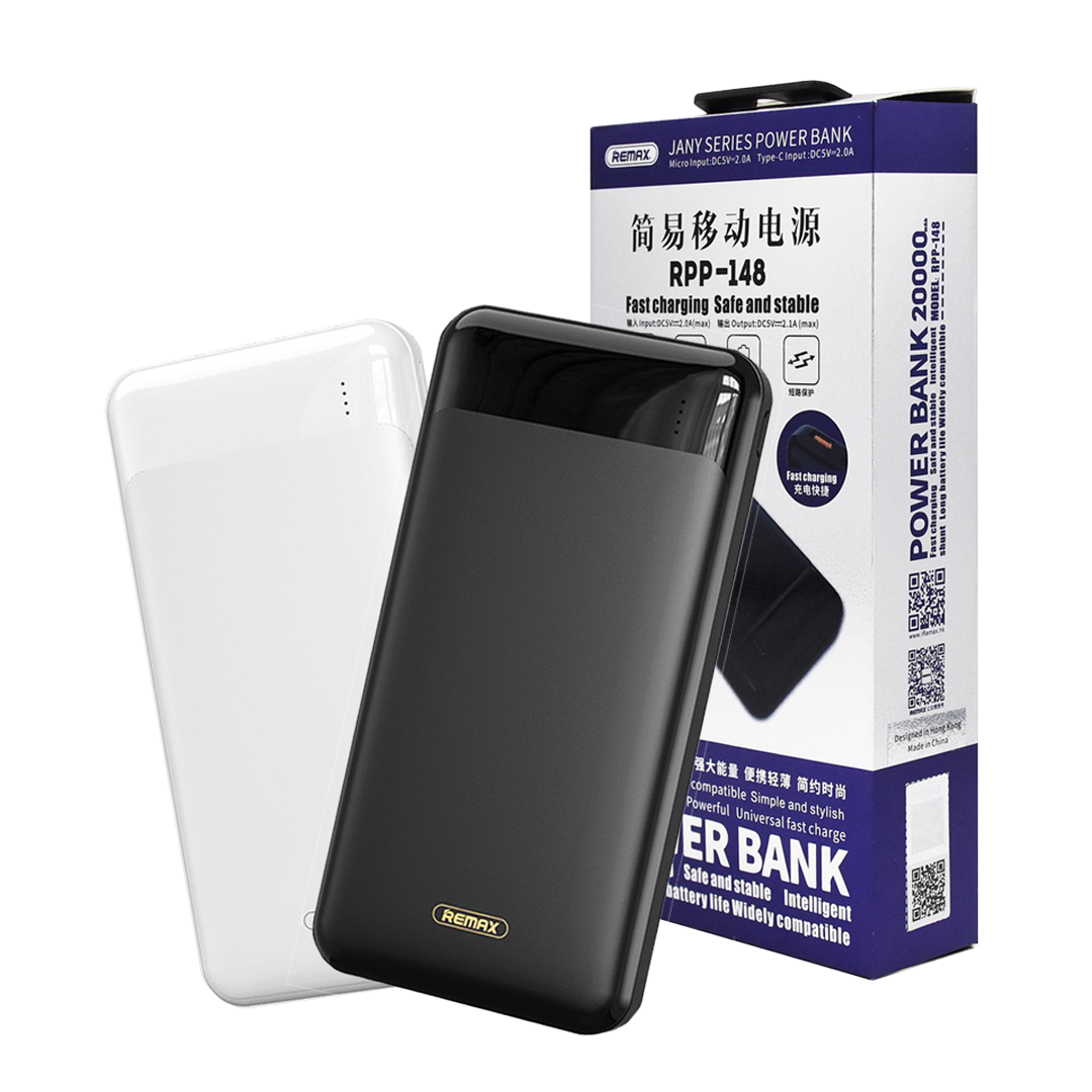 Remax RPP-148 20000mAh Jany Series Dual Inputs Fast charging Power Bank has a dual USB interface that supports charging 2 devices at the same time with maximum output DC5V – 2.1A. Because the USB outputs are re-equipped with intelligent charging technology, the connected devices are recognized and the correct amount of power is delivered. This allows you to charge multiple devices simultaneously with the power bank. Large capacity, fast charging, compact design will not make you disappointed.